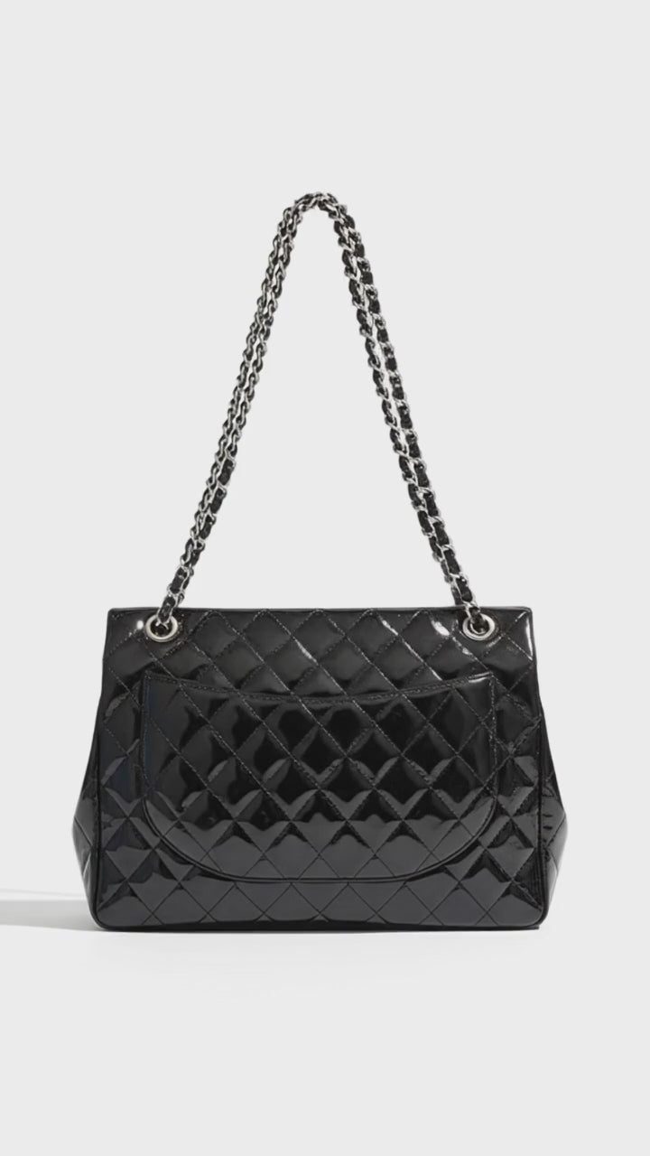 Diamond quilting in lacquered black, finished with silver-tone hardware for a cool, architectural contrast. A discontinued single-flap silhouette with presence—measured, precise, and unmistakably Chanel.