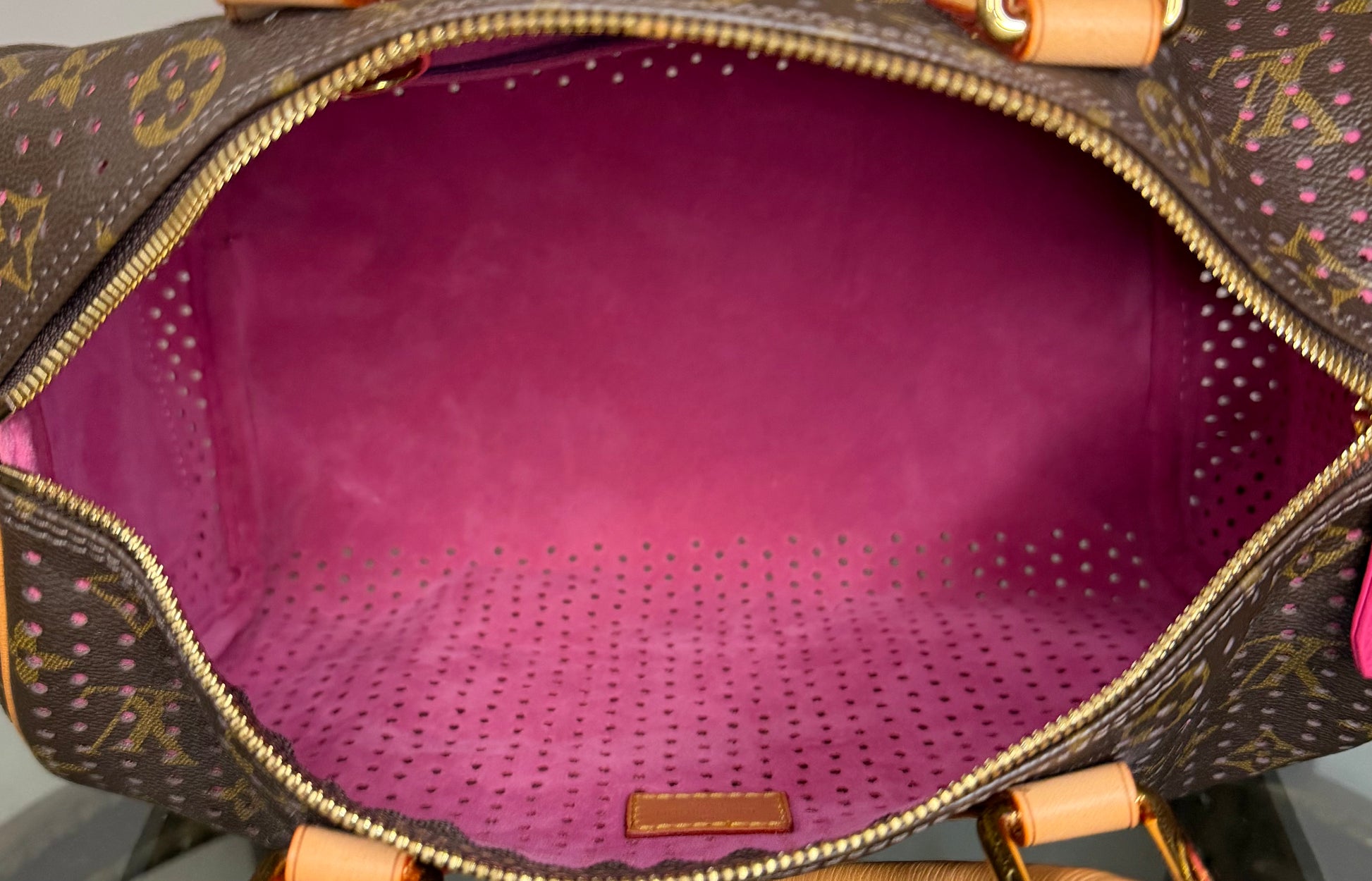 Executed in Monogram Perforated canvas with a bright fuchsia underlay, set against natural vachetta leatherhandles and trim, it is equal parts couture flourish and timeless design. The effect is unmistakable: a storied icon, lightly re‑interpreted for collectors who recognize rare editions the moment they appear.
